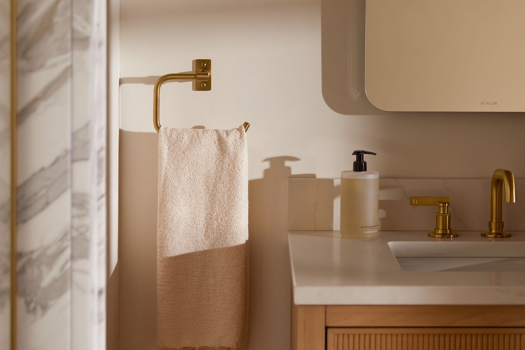 Drawing inspiration from the archives, the Castia bathroom faucet and accessory collection from Kohler x Studio McGee combines classic and modern influences in a timeless expression for the home. Crafted with meticulous attention to detail, the bathroom accessories showcase stacked connection points in a subtle homage to the raw beauty of pipe fittings. Ever versatile, the Castia collection effortlessly harmonizes with a variety of environments.